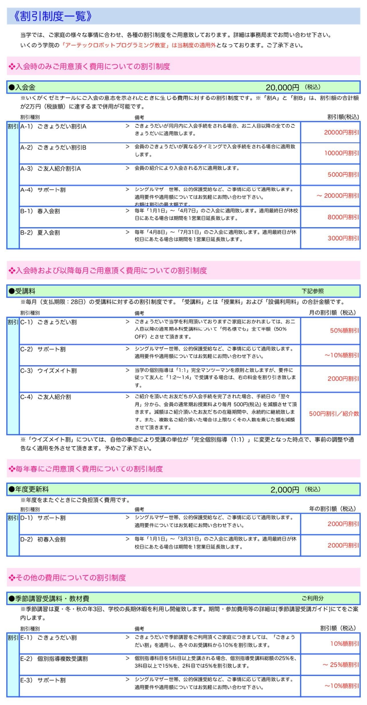 > | ご紹介を頂いたお友だちが入会手続を完了された場合、手続日の「翌々月」分から、会員の通常期お授業料より毎月 500円(税込) を減額させて頂きます。減額はご紹介頂いたお友だちの在籍期間中、永続的に継続致します。また、複数名ご紹介頂いた場合は上限なくその人数を乗じた額を減額させて頂きます。 | 500円割引/紹介数 | |||